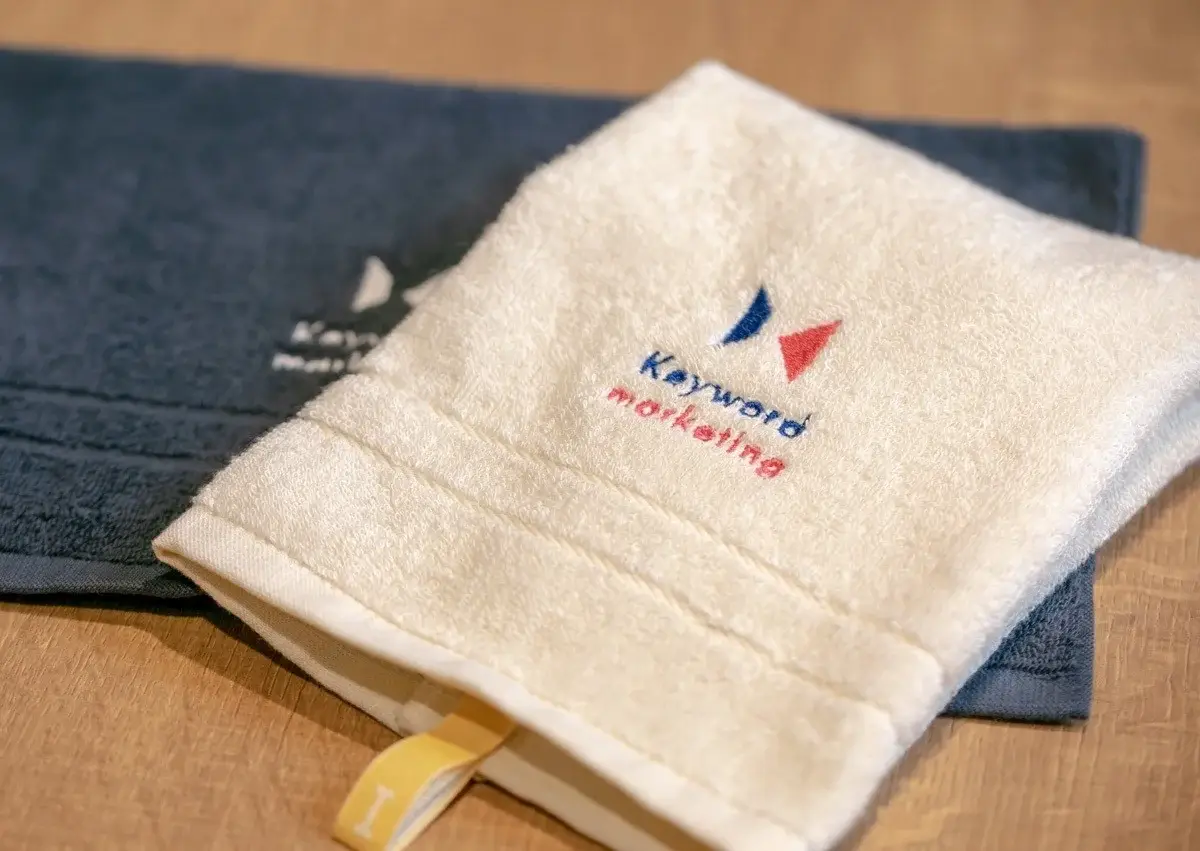 採用活動で、面接に来られた方にお配りする目的で作られました。企業ロゴが主張し過ぎないサイズで、というご要望にお応えして刺繍サイズを調整。2色展開で、タオルの色に合うように、糸の色を変えて表現しています。