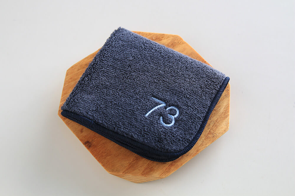 キャンペーン期間中に5,500円以上お求めで、ご応募いただいた方全員(先着順)に73周年記念タオルハンカチをプレゼントさせていただきます。ネイビーの優しい肌触りのタオルハンカチに、ブルーカラーで「73」と刺繍を施しました。